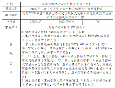 2026年工商業(yè)分布式光伏主材采購項目招標(biāo)代理抽取于2026年1月27日在衡陽國投4棟3樓評標(biāo)室進行了隨機抽取,現(xiàn)將相關(guān)信息予以公示。